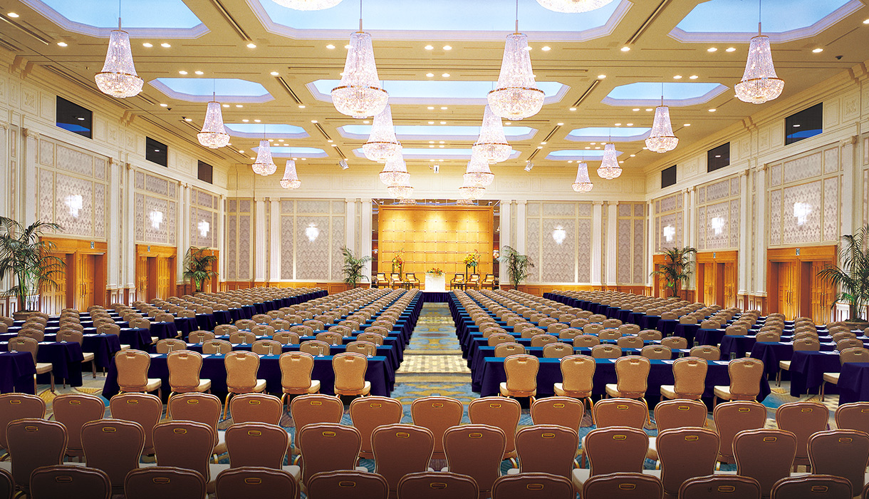 オーストリア・ロブマイヤー社製のシャンデリアが煌めく、天井高8mの高級感あふれるメインバンケット。パーティー・国際会議・イベントなど、様々にご利用いただけます。最新の音響・照明設備、同時通訳などのマルチメディアに対応した機能も完備。
