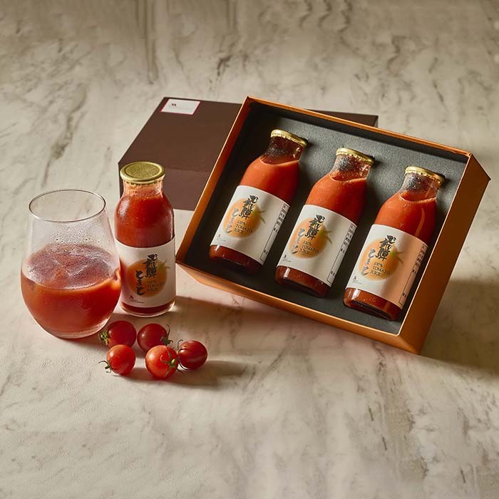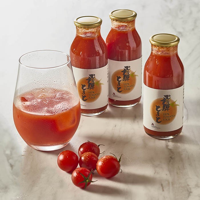 岐阜県飛騨高山で育まれたミニトマト「キャロルポポ」を、ひと瓶に約25個使用した無添加ストレートジュース。