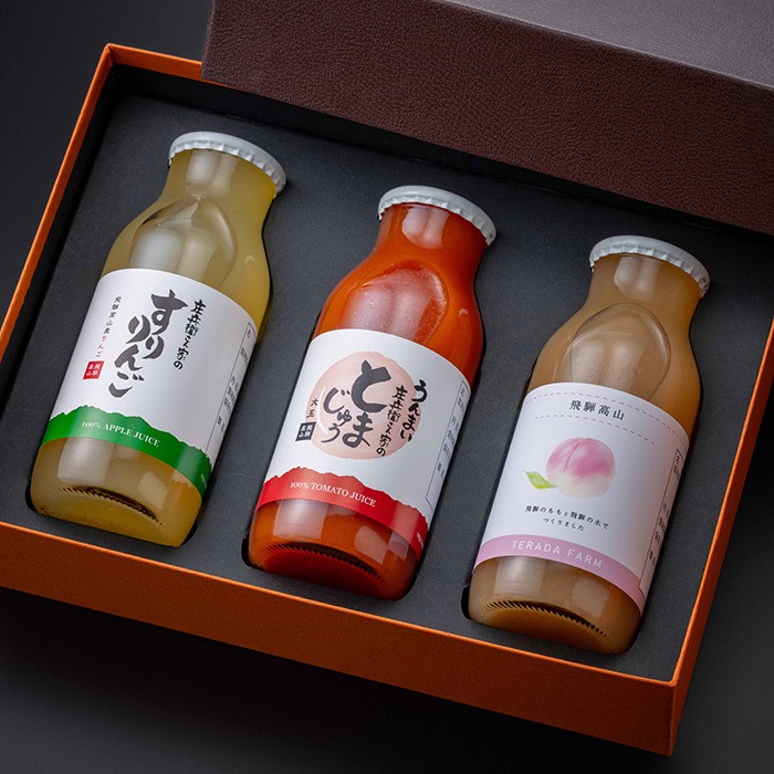 庄兵衛さん家のすりりんご、庄兵衛さん家のとまじゅう 大玉、飛騨のたからもの 桃 を3本セットでご用意いたします。