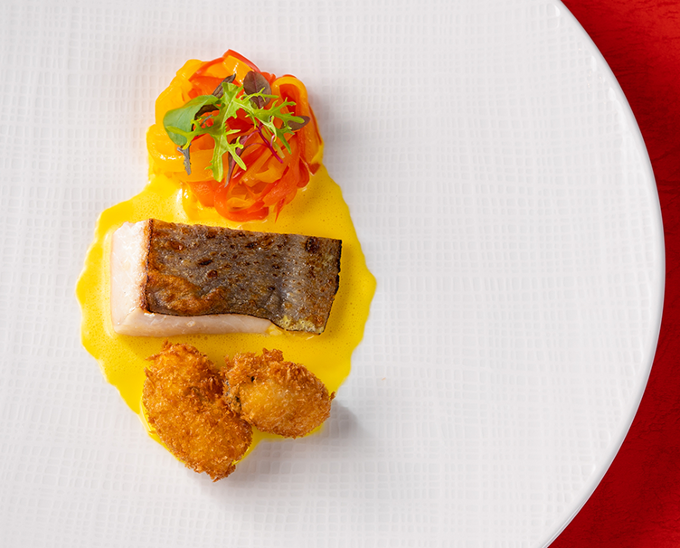 ふっくら柔らかく焼き上げ、ムール貝のだしにサフランを加えたソースで