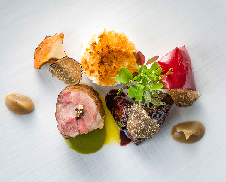 シーズンを迎える香り高い松茸の温かな前菜をはじめ、鱈を使った魚料理や豚肉料理にもさまざまな季節野菜を取り入れています。根菜や栗、きのこ、リンゴといった実りの季節ならではの食材が生み出す味わい豊かなコースを通じて秋をお楽しみください。