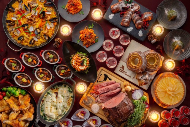 カットサービスにてご提供するパーゴラ名物のローストビーフをはじめ、ゲストの目の前で仕上げるパスタや、こんがりと焼き上げたローストチキン、シーフードパエリア、牛肉の赤ワイン煮込みなど、クリスマスのご馳走を賑やかに取り揃えました。ご家族やお仲間と一緒に、心躍るひとときをブッフェにてご満喫ください。