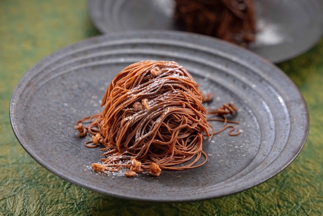 ◎ブッフェ・ドルチェ大人気のしぼりたてモンブランは、ひんやりアイスにチョコと栗のモンブランクリームを目の前でしぼってご提供します。抹茶タルトや柚子ゼリー、チョコブラウニーのベリー添え、大学芋など、今冬のおすすめを取り揃えました。