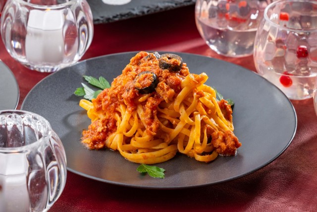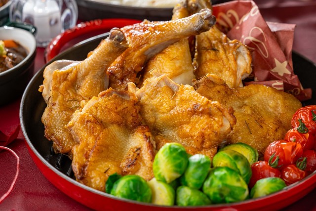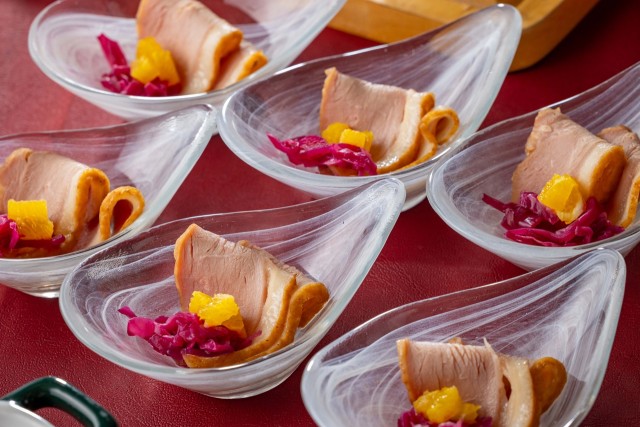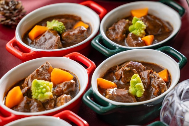 カットサービスにてご提供するパーゴラ名物のローストビーフをはじめ、ゲストの目の前で仕上げるパスタや、こんがりと焼き上げたローストチキン、シーフードパエリア、牛肉の赤ワイン煮込みなど、クリスマスのご馳走を賑やかに取り揃えました。ご家族やお仲間と一緒に、心躍るひとときをブッフェにてご満喫ください。