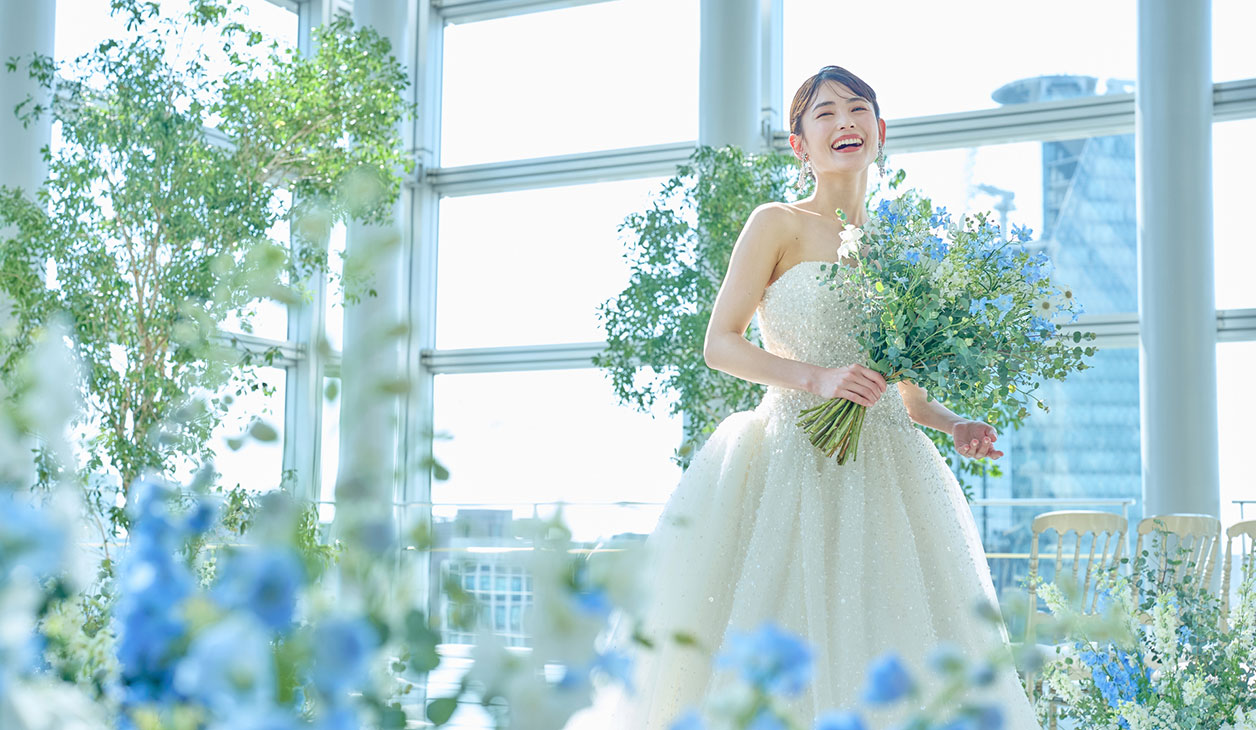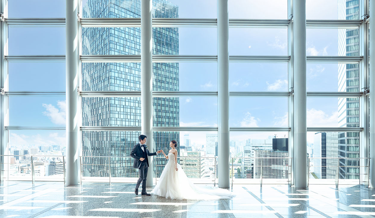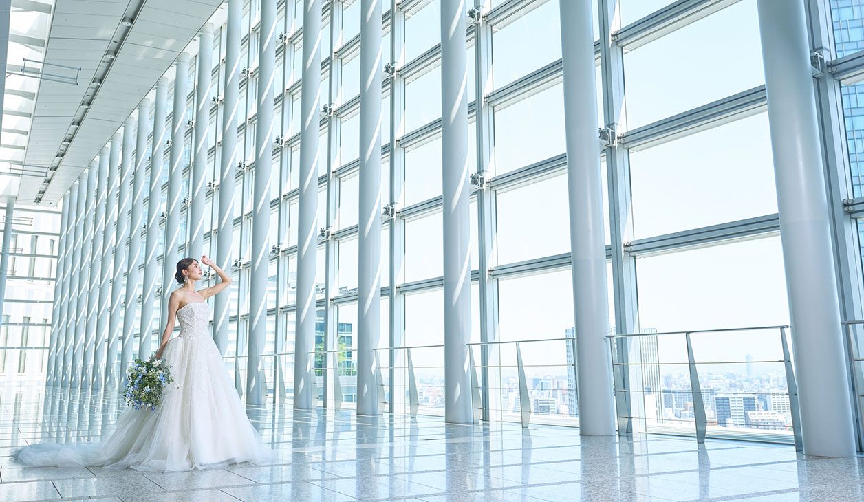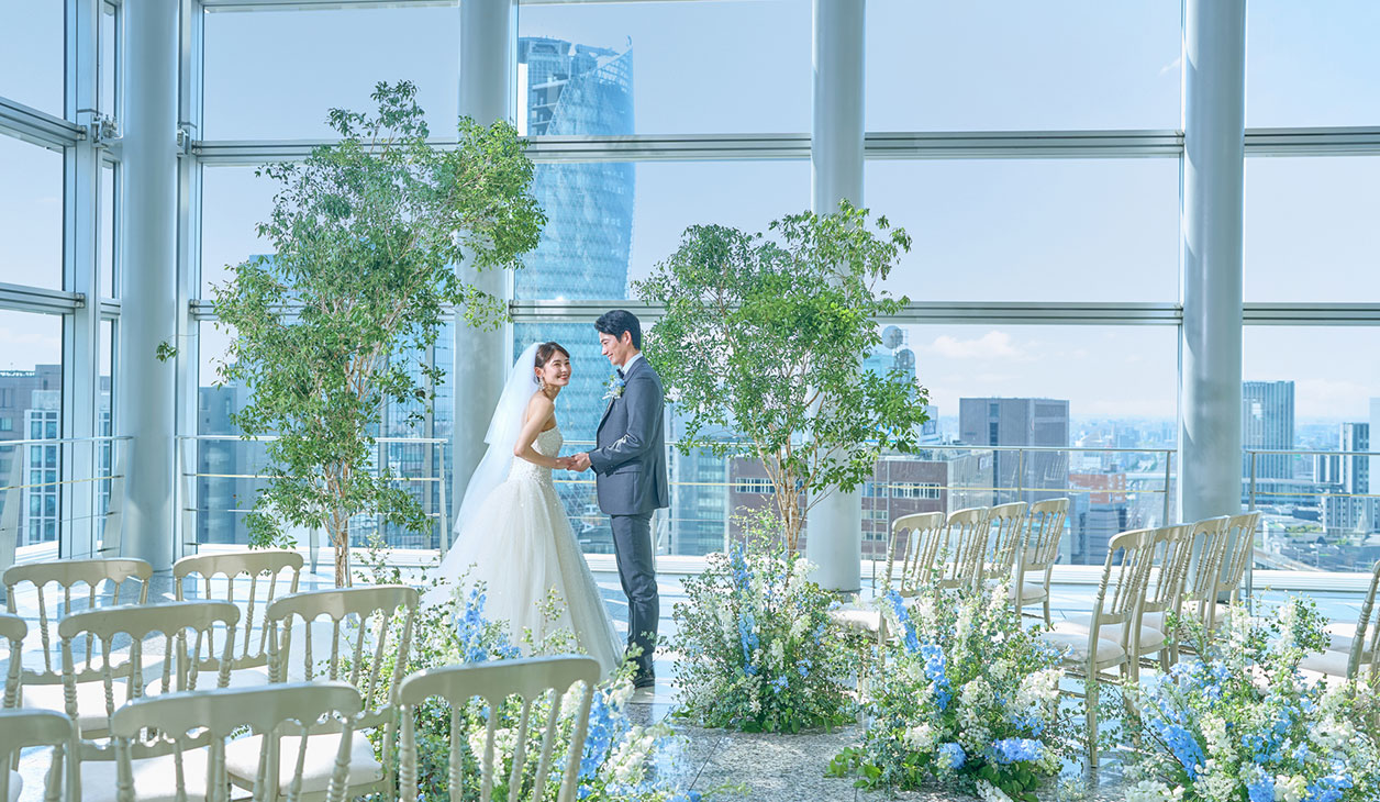 8mの天井高に全面ガラス張りの荘厳なセレモニースペース。大きな窓からは名古屋の街並みをふたり占め。柔らかな陽の光が、花嫁の透明感をより一層引き立てます。