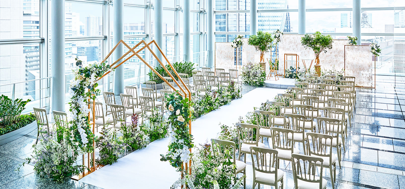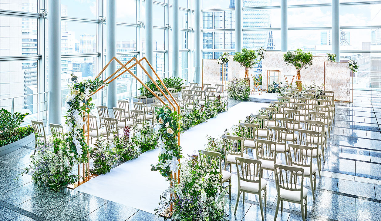 開放感に満ち溢れた自然光の差し込むガラス張りの大空間で、ゲストの心を温かく包み込むセレモニー。