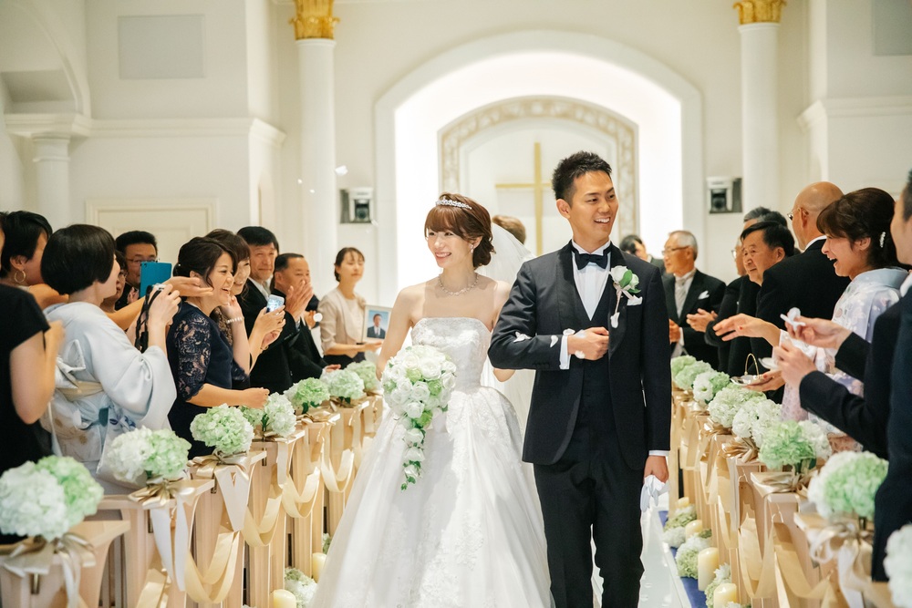 輝く大理石のバージンロードにはおふたりのシルエットが美しく映り、幻想的な雰囲気に。