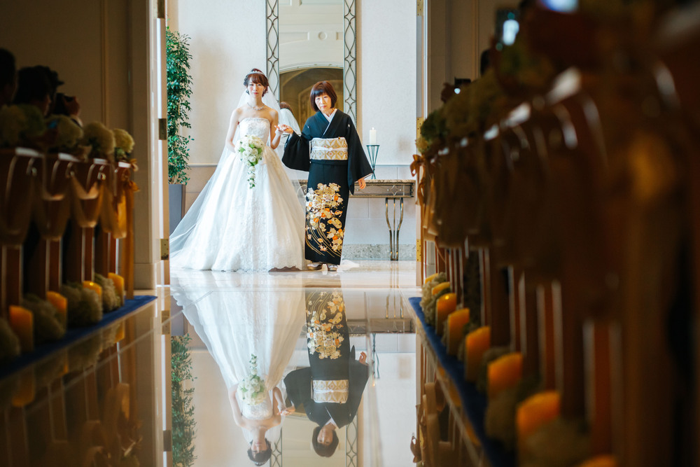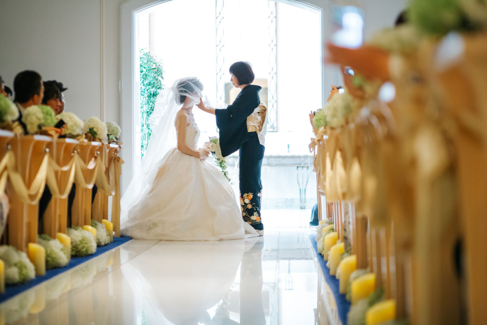 今まで大切に見守ってくださったお母様にベールダウンをさずけられ、ご新婦様はバージンロードを進まれました。