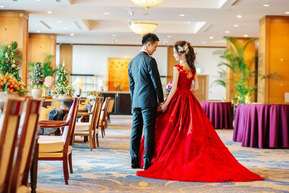 お色直しではなめらかな質感の麗しいレッドに、圧倒的な存在感を放つエンブロイダリーレースを大胆に配したドレスに。