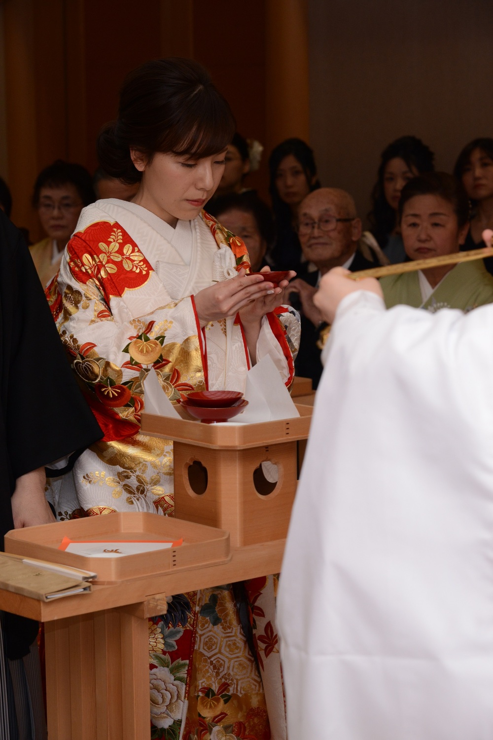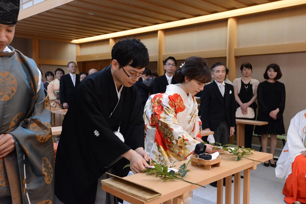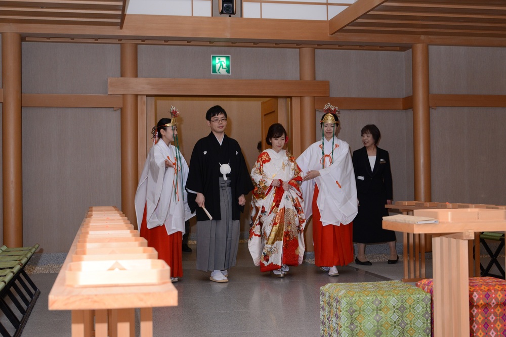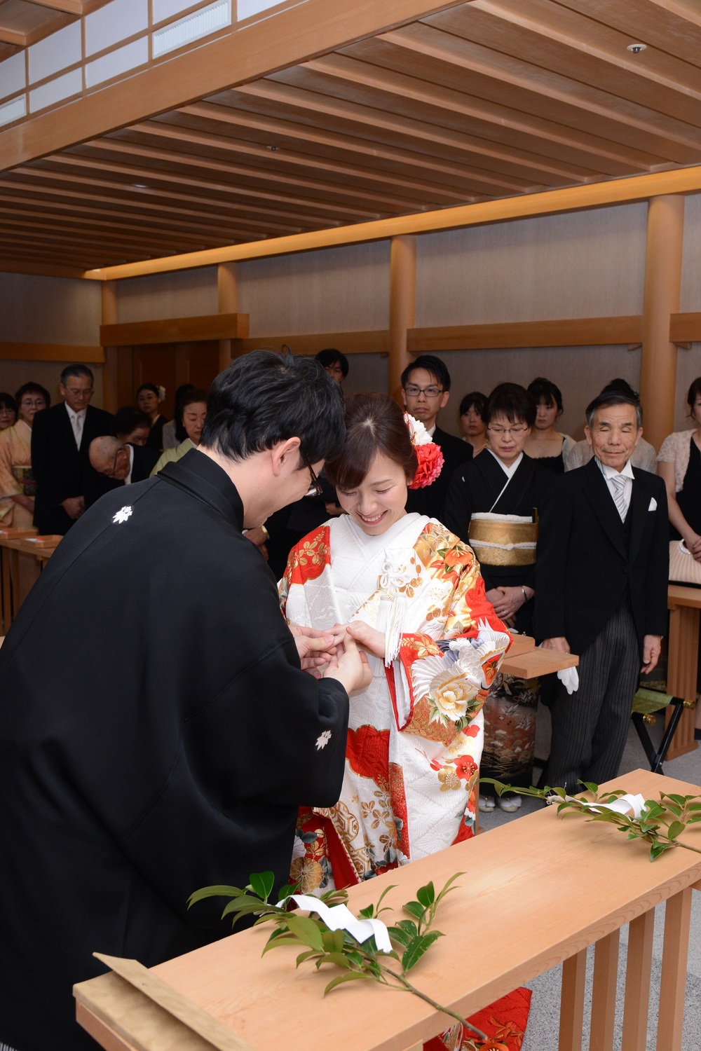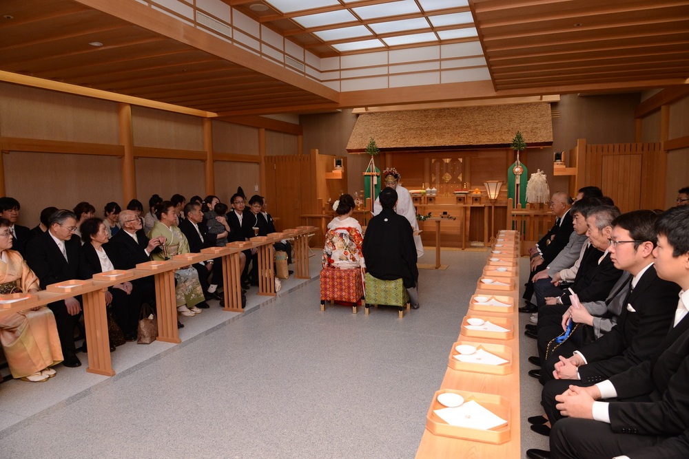 挙式は熱田神宮の御神符を奉納した格式高い神殿にて。