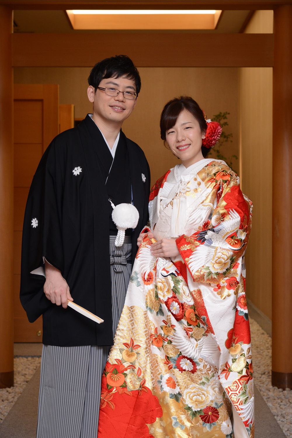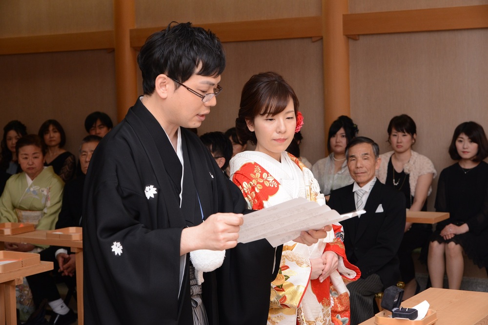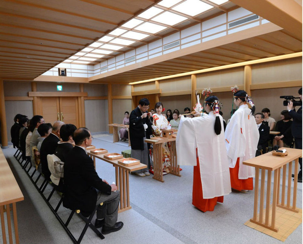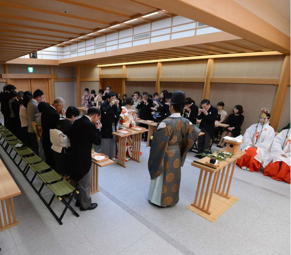 挙式は熱田神宮の御神符を奉納した格式高い神殿にて。