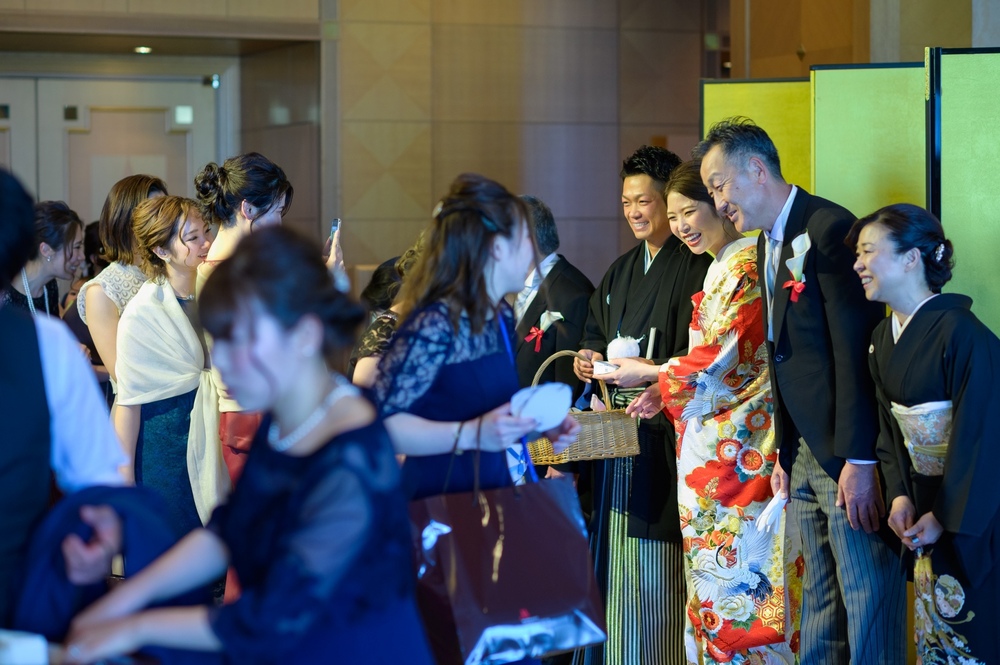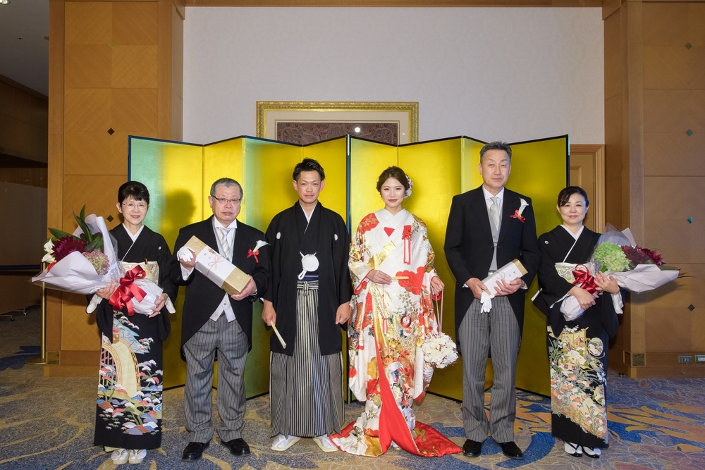お色直しは、がらりと印象を変え赤い色打掛と紋付でご入場。