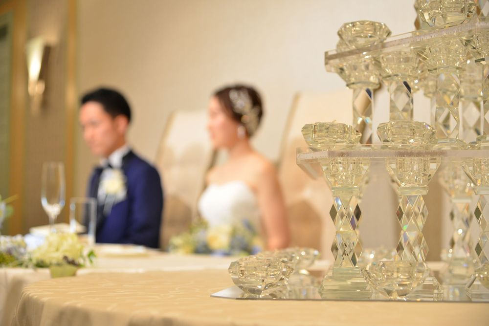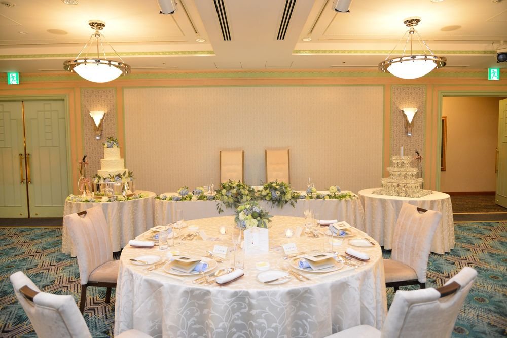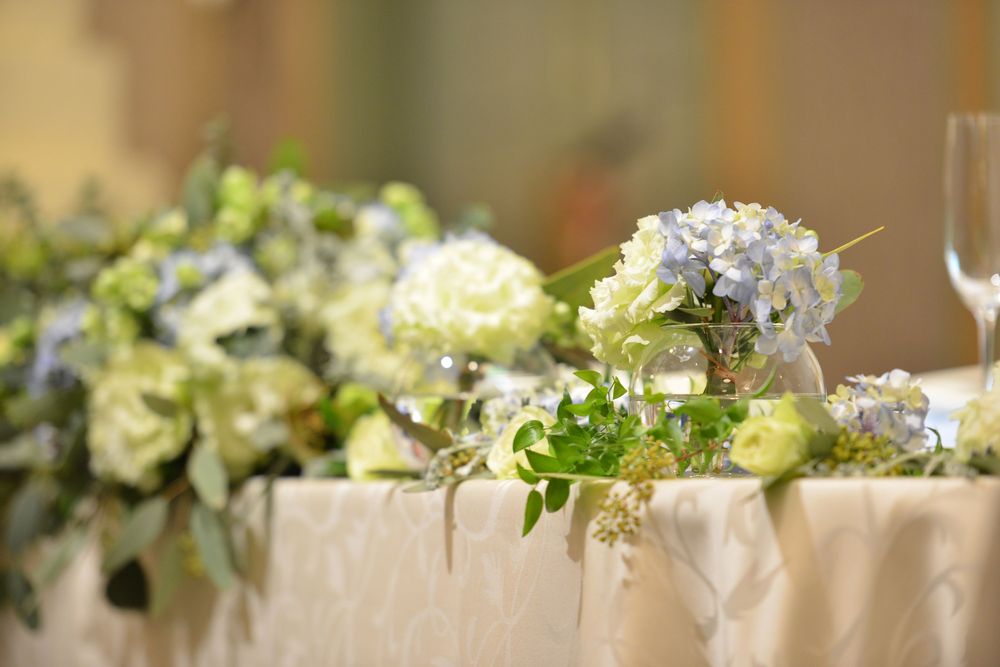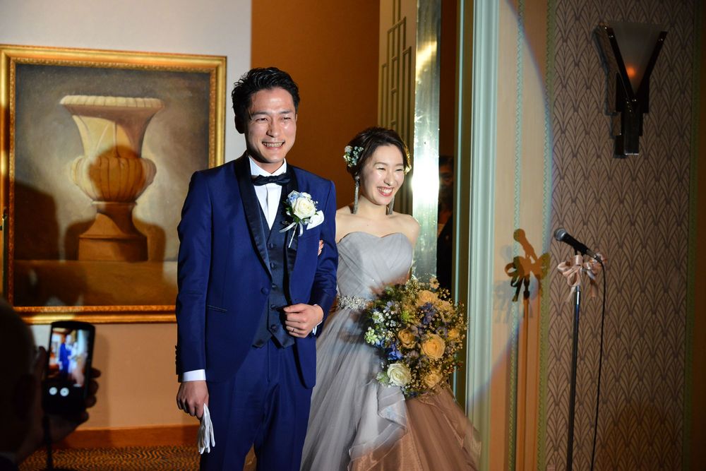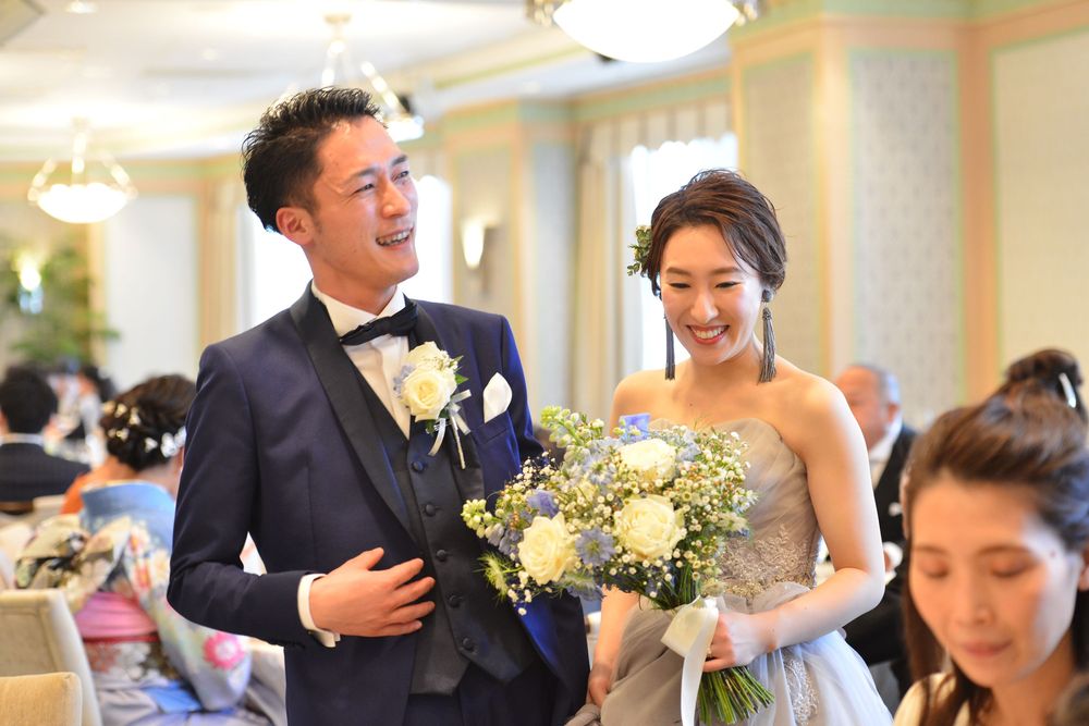 ブルーグレーのカラードレスをオシャレに着こなす新婦様 アクセサリーのセレクトにもセンスが光ります ご披露宴は 地上200mからの眺望をお楽しみいただける「ジュピター」にて こだわりのお花のコーディネートは 大人かわいい 爽やかなお色味 優しい自然光がたっぷりと入るお部屋で ゲストの方々とたくさん言葉を交わされ おふたりの明るいお人柄が表れた あたたかな雰囲気のご披露宴となりました