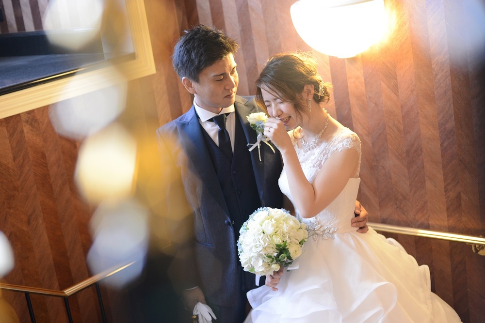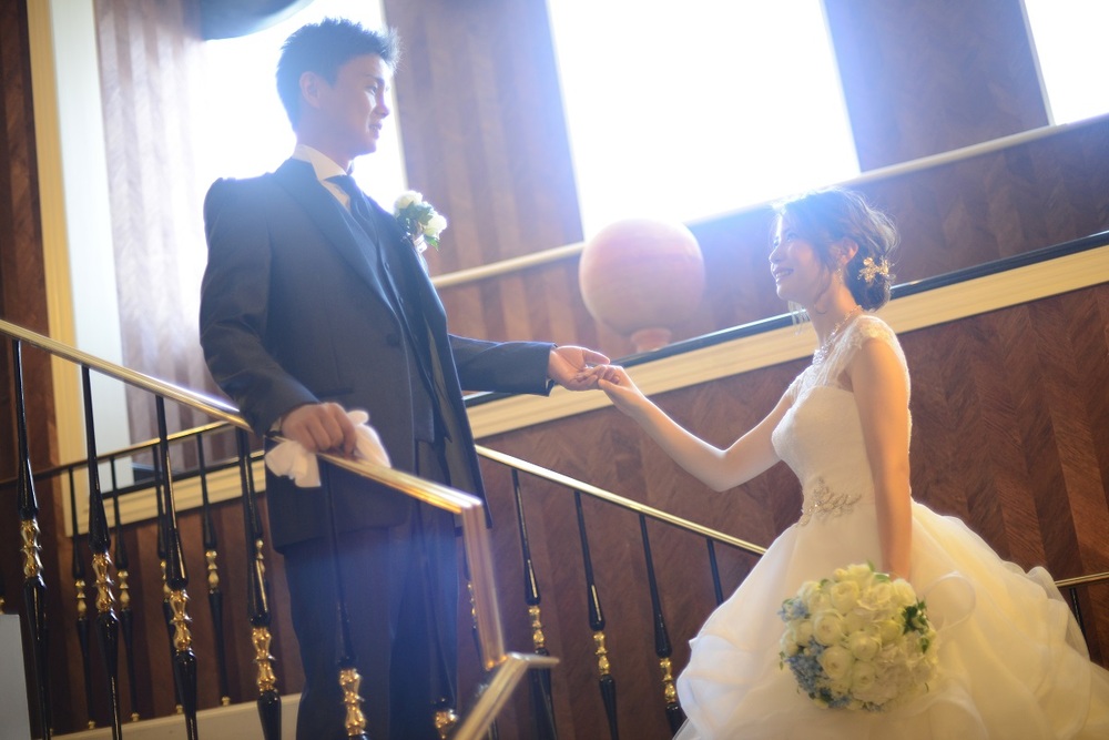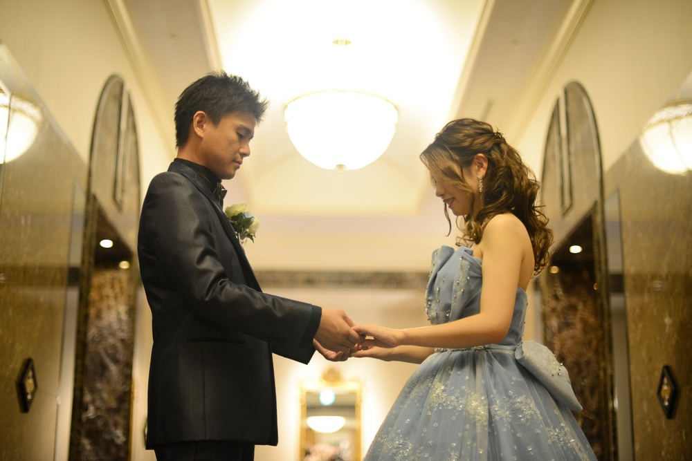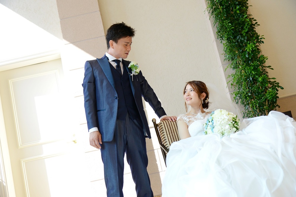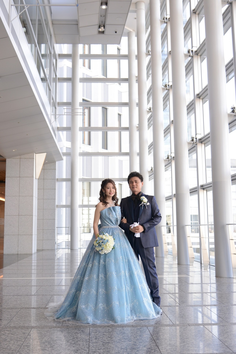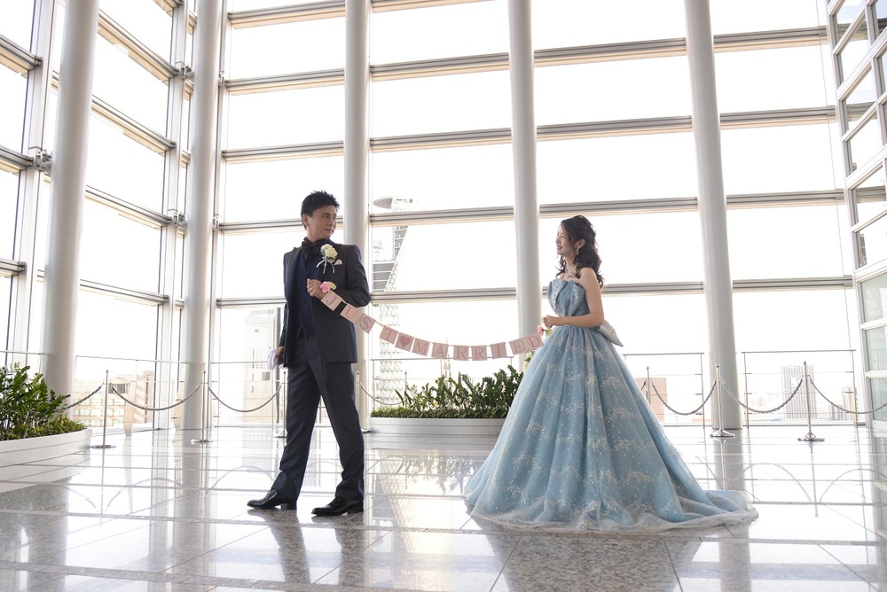 前撮りをされたおふたりのお写真をご紹介 胸元にレースをあしらった上品なウェディングドレスと お色直しではビジューやチュールがポイントの可愛らしい水色のドレスをセレクト マリオット館内の至る所で華やぐ おふたりの笑顔が印象的でした