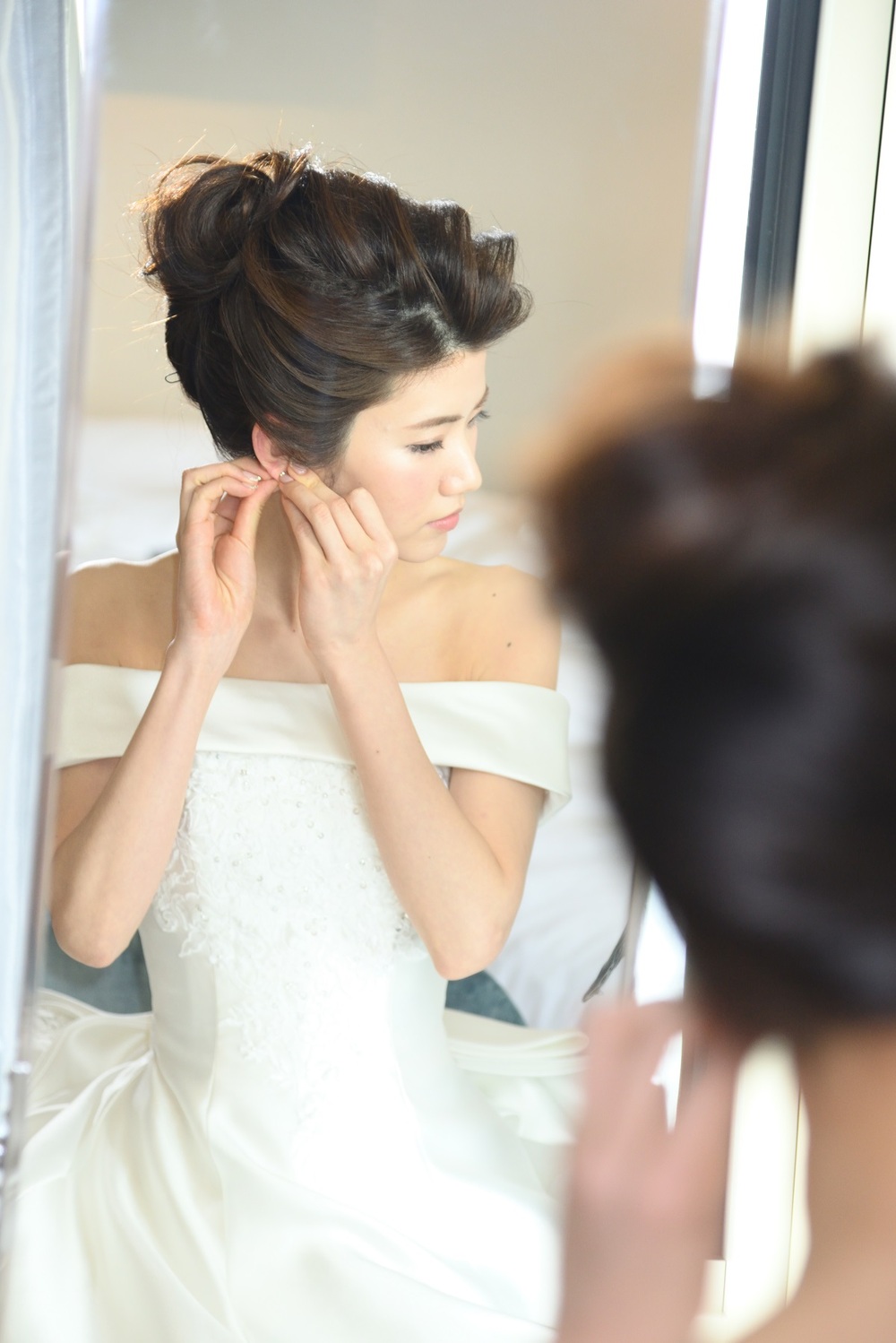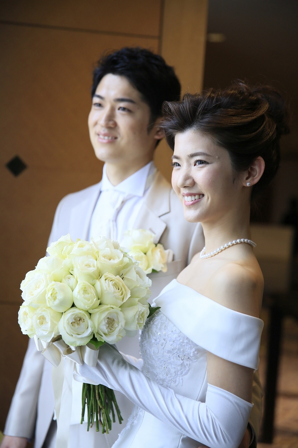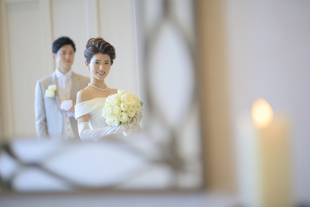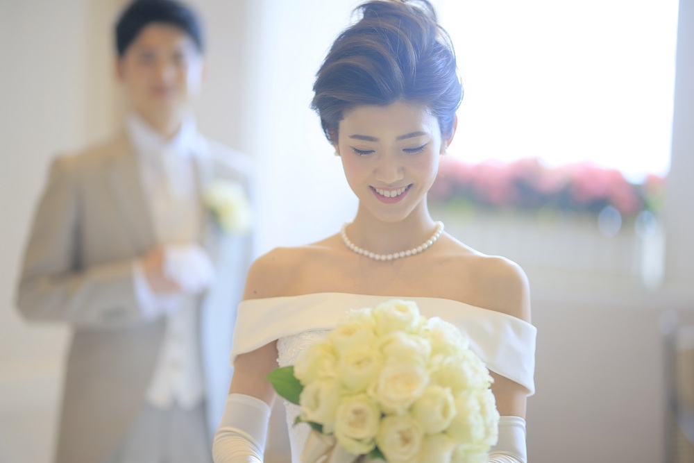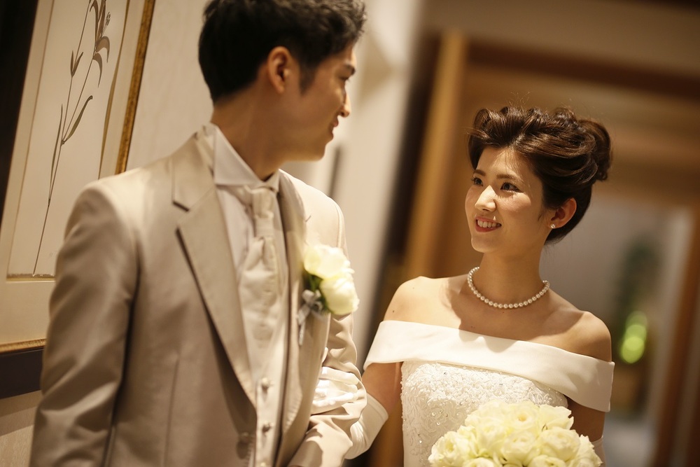 挙式のウェディングドレスはオフショルダーのクラシカルな雰囲気、披露宴の入場ではレースをあしらった上品なロングスリーブ、