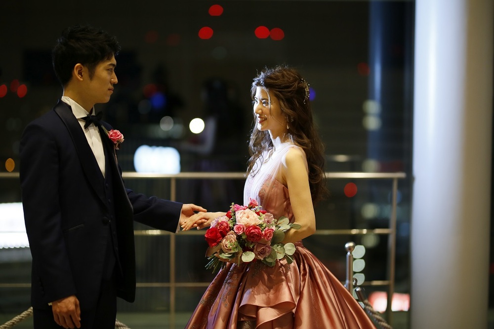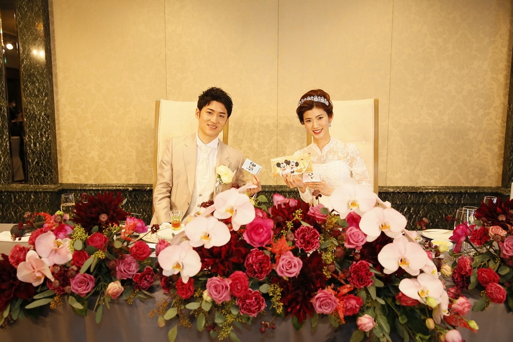 ご新郎様がサプライズで用意した「真実の愛」「本物の愛」という意味を持つ薔薇40本の花束をお渡しされた瞬間は