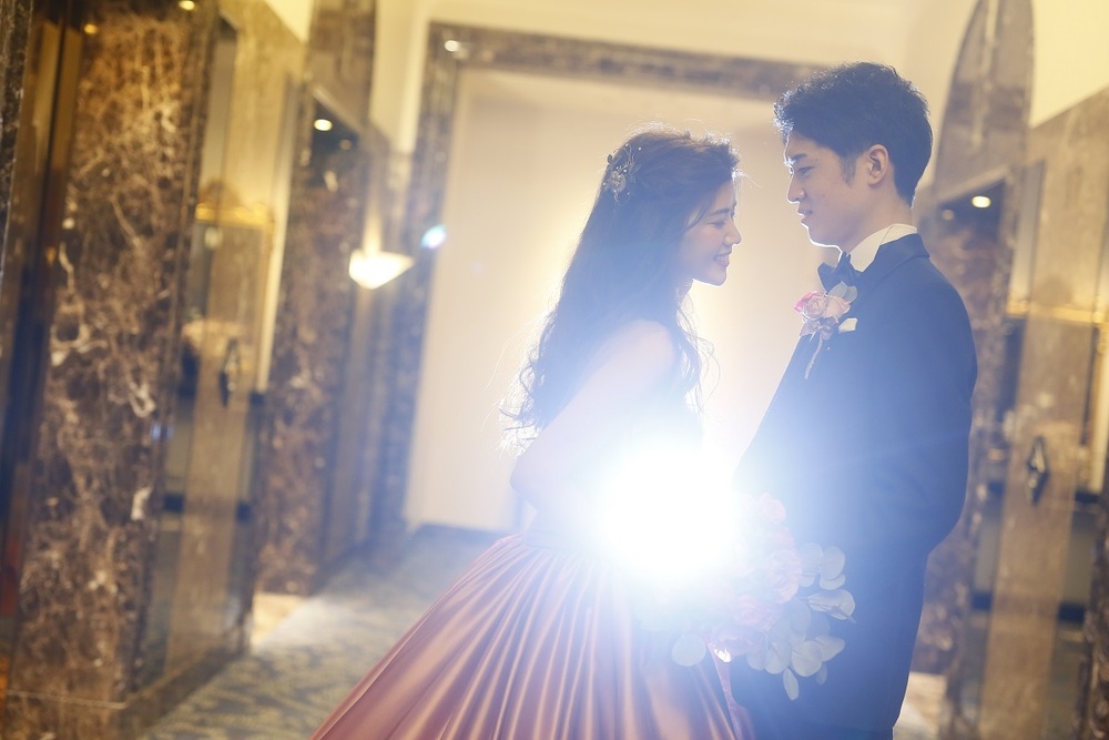 お色直し後はサテンとチュールの素材を合わせたお洒落な淡いピンクのカラードレスを選ばれたご新婦様。