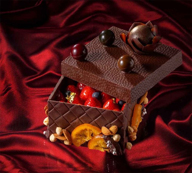 ドライオレンジやナッツをふんだんに使用したチョコレートBOXの蓋を開けると鮮やかな静岡県産紅ほっぺが。
