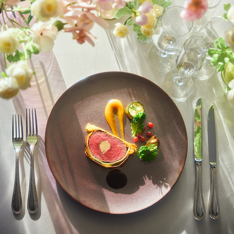料理人の想いは、おふたりのおもてなしの心を一皿一皿の料理を通してゲストへお届けすること。選び抜いた食材を使用し、最高の状態で、最高のパフォーマンスで創り上げるウエディング料理をお楽しみください。
